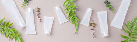 Skincare organic beauty product bottles, green plant leaves on gray background