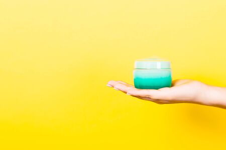 Female hand holding cream bottle of lotion isolated. Girl give jar cosmetic products on yellow background.