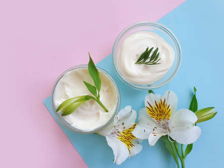 cosmetic cream, flower on a colored background