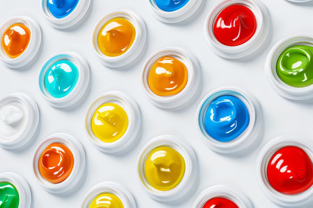 Top view of multicolored plastic jars on a white background.