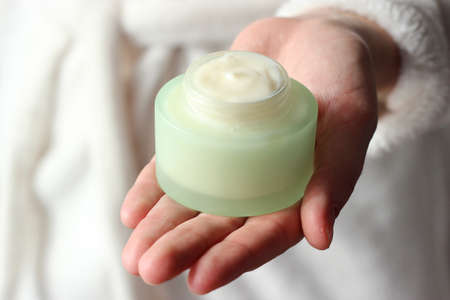 female hand white jar with cream skin care health dermatology