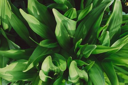 Green leaves of garden plants in spring. Green leaves of flowers. Park flower bed. Spring season. Spring gardening. Seedlings of plants. Background image.