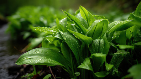 Bright green leaves with water droplets reflect the freshness of spring. Located beside a gentle stream, the vibrant foliage thrives in the damp environment, showing nature's beauty