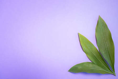 simple flat lay of green leaves on a lilac pastel background, concept of summer, nature, copy space for text