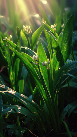 The Garlic in spring, fresh green leaves, soft sunlight filtering, vibrant atmosphere full of vitality, natural textures, serene mood P.