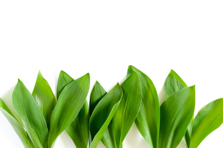 Spring wild garlic leaves on a white background. Place for text. Recipe. Vitamin. Place for text.