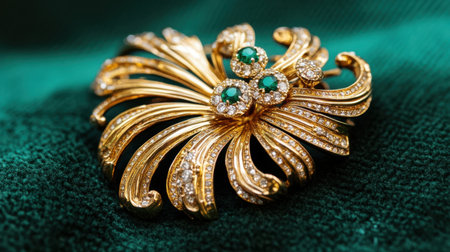 This exquisite vintage gold brooch features intricate designs adorned with green gemstones and sparkling diamonds, beautifully displayed on rich velvet.