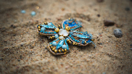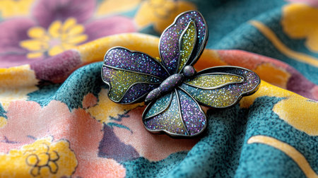 A stunning close-up of a colorful butterfly brooch resting on vibrant floral fabric. The intricate details and sparkling textures create an eye-catching visual, perfect for fashion enthusiasts and nature lovers.