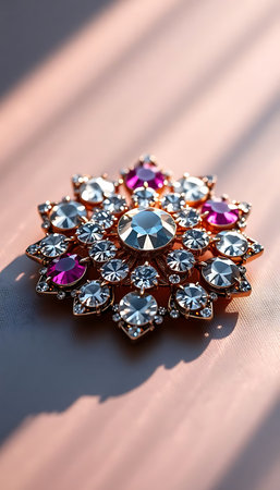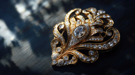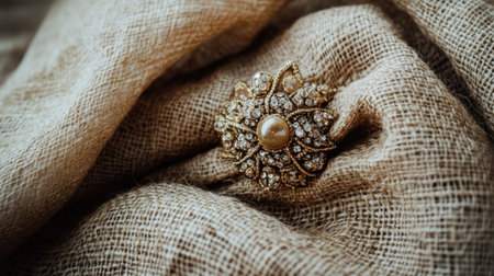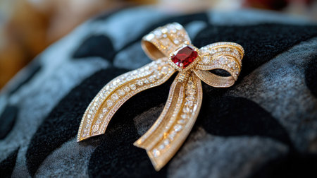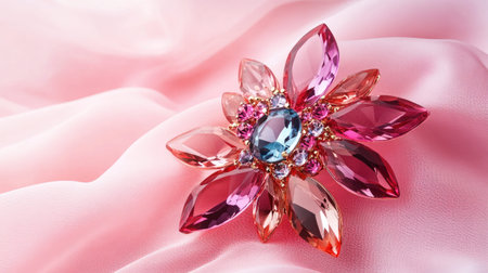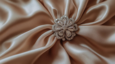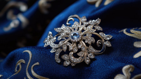 A stunning brooch sits gracefully on soft satin fabric, showcasing intricate design and sparkling gemstones. Perfect for fashion and jewelry themes.