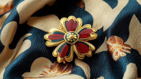 A stunning close-up of a colorful flower brooch resting on luxurious fabric. The intricate design features bold colors and elegant patterns, highlighting the beauty of jewelry.