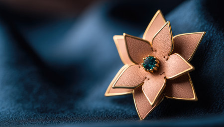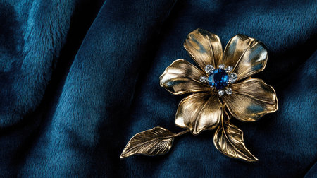 This stunning image captures an elegant gold flower brooch adorned with a blue gemstone, elegantly resting on luxurious deep teal fabric. A true statement piece.