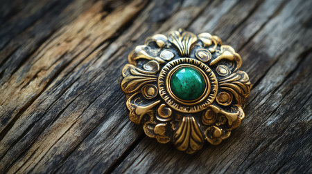This striking vintage gold brooch features an intricately designed floral motif with a vibrant green stone at its center, resting atop a textured wooden background, ideal for showcasing elegance in jewelry.