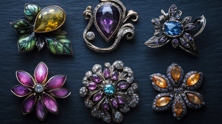 A stunning display of vintage brooches showcasing intricate designs and vibrant gemstones. Perfect for fashion enthusiasts and jewelry collectors.