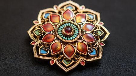 A stunning close-up of an ornate decorative pendant showcasing intricate leaf patterns and colorful gemstones, perfect for jewelry lovers and art enthusiasts.