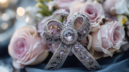 An exquisite brooch adorned with sparkling gemstones rests gently atop a bouquet of pale roses. The soft focus and delicate bokeh enhance its elegance, perfect for fashion and wedding themes.