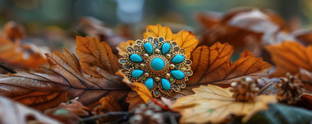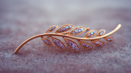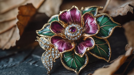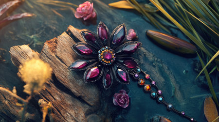 This captivating image features an elegant flower brooch adorned with colorful gems, set against a stunning natural background with delicate leaves and flowers.