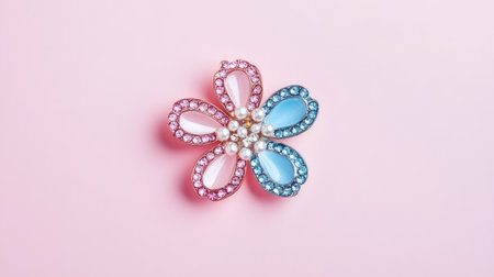 A beautiful decorative flower brooch featuring colorful stones and pearls, perfectly arranged on a soft pink background, ideal for fashion and jewelry lovers.
