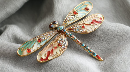 This captivating dragonfly brooch showcases vibrant enamel colors and sparkling gems, resting elegantly on a soft textile backdrop, perfect for any fashion statement.