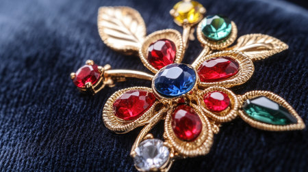 A stunning vintage brooch adorned with colorful gems resting elegantly on a soft satin fabric, showcasing intricate craftsmanship and timeless beauty.