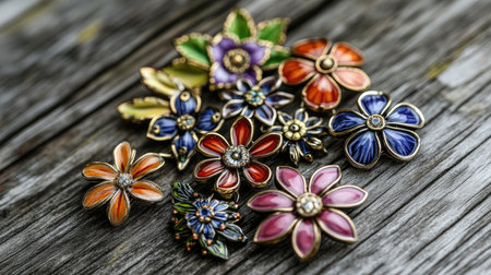 A stunning collection of colorful floral brooches displayed on a rustic wooden surface, showcasing intricate designs and vibrant hues perfect for any occasion.