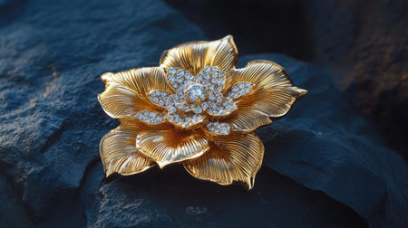 This exquisite golden flower brooch features intricate details and sparkling diamonds, resting gracefully on a dark stone background, symbolizing luxury.