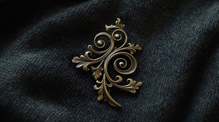 This stunning ornate metal brooch features intricate swirls and leaf designs, beautifully displayed on a textured dark fabric backdrop, showcasing elegance.