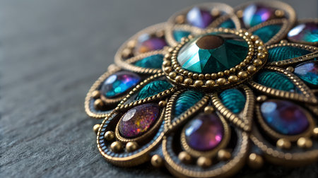 Close-up of an elaborate gemstone jewelry piece sparkling with colors
