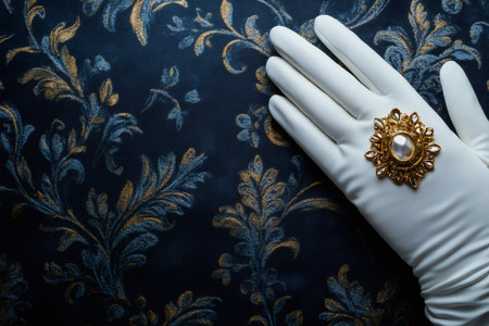 White glove with golden brooch and pearl resting on blue and gold floral damask fabric, evoking vintage elegance and luxury