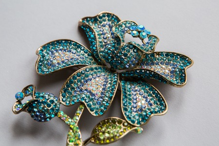 Decorative fashion flower shaped brooch with blue stones, vintage background.