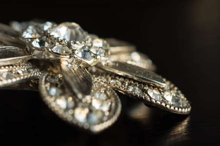 A gem-encrusted brooch on a classic evening dress, with lighting enhancing its sparkling and sophisticated design.