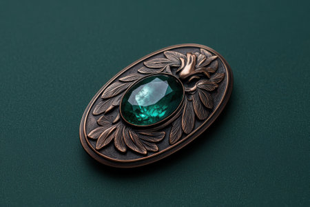 Stunning vintage brooch featuring a captivating green gemstone, set against a soft textured fabric background. The intricate design highlights the beauty of antique craftsmanship.