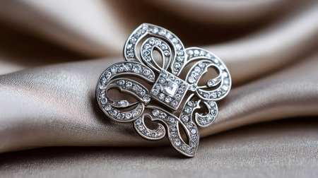Elegant silver brooch adorned with crystals, resting on a luxurious silk background, showcasing luxury and style