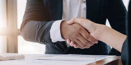 Man and woman hand shaking. Handshake after good cooperation, Businesswoman Shaking hands with Professional businessman after discussing good deal of contract. Business concept.