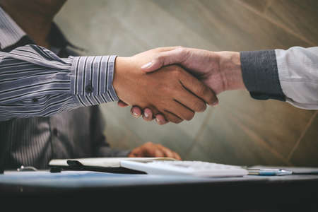 Close up of Business people shaking hands, finishing up meeting, business etiquette, congratulation, merger and acquisition concept