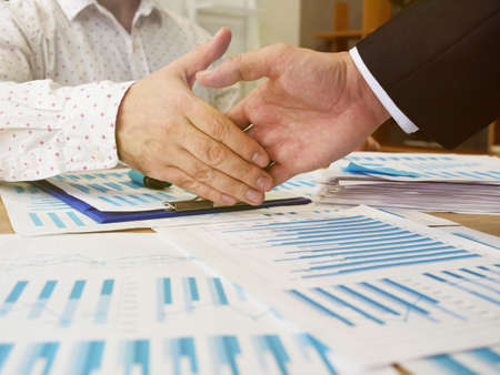 Shaking hand two business leaders talk about charts, financial graphs showing results are analyzing and calculating planning strategies, business success building processes.