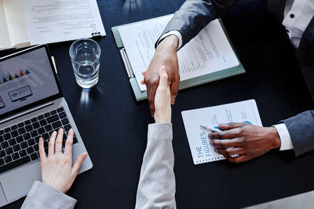 Top view closeup of African American executive shaking hands with female business partner at meeting table