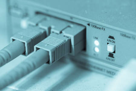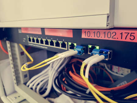 Optical cable in internet network devices. Green and yellow optical fiber cable in switch. Concept of modern Internet connection. Selective focus, close up, soft and blurred background.