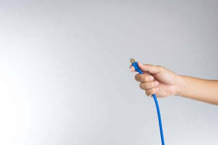 Man's hand holds yellow cable on white background. He is trying to connect computer to the internet instead of a wifi connection