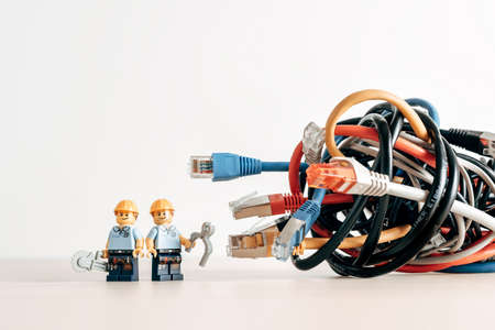 Technicians and a tangled bunch of network cables. Illustrative editorial. Illustrative editorial. June 22, 2021