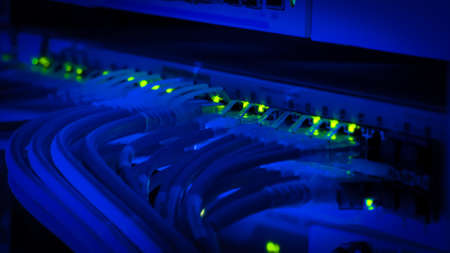Detail of RJ45 Lan Cables and lights on network switches. Macro Shot