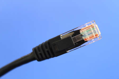 Rj45 cable and network card slot. Cable for data transmission in a computer network. Dark background.
