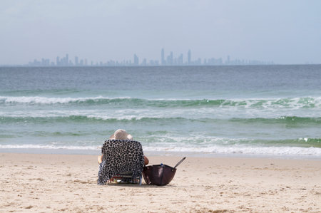 Rear view of a woman sitting on a deck chair on the beach of Coolangatta with the city skyline of Surfers Paradise in the background