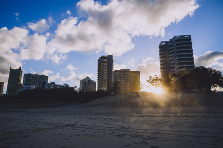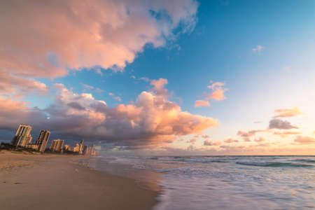 Picturesque beach with skyscrapers on the background. Sunrise in Surfers Paradise, Gold Coast in Australia