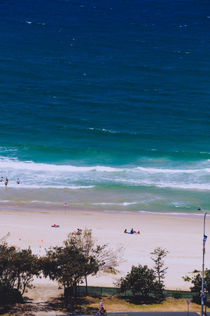 GOLD COAST, AUSTRALIA - January 6th, 2015: the beach in Surfers Paradise with golden sand, skyscrapers facing the blue Pacific Ocean and greenery
