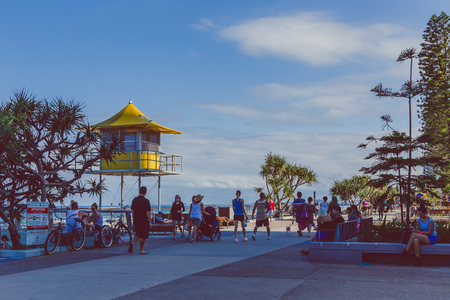 GOLD COAST, AUSTRALIA - APRIL 16, 2018: People at Surfers Paradise, one of main tourist destination for entertainment, tourism activity and shopping at Gold Coast.