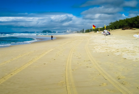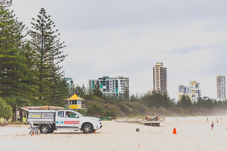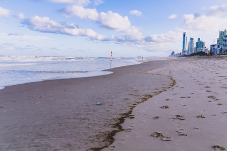 GOLD COAST, AUSTRALIA - January 5th, 2015: the beach in Surfers Paradise on an overcast day with golden sand and covered sky above the Pacific Ocean