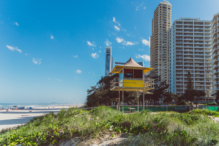 GOLD COAST, AUSTRALIA - January 15th, 2015: iconic yellow lifeguard hut on the beach in SUrfers Paradise