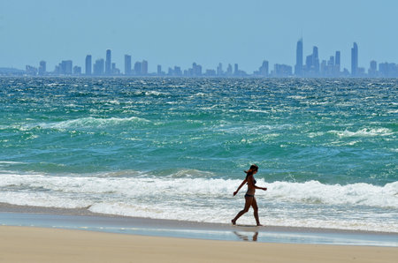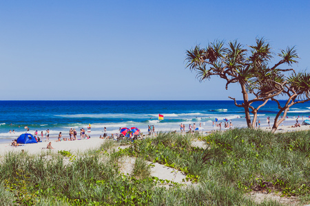 Gold Coast, Australia - February 21, 2016: Burleigh beach at Coolangata with Gold Coast skyline in the distance and people on the foreground