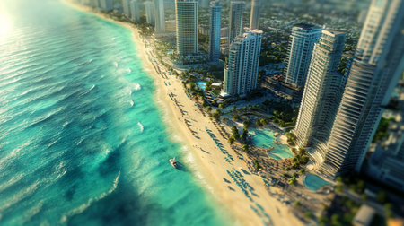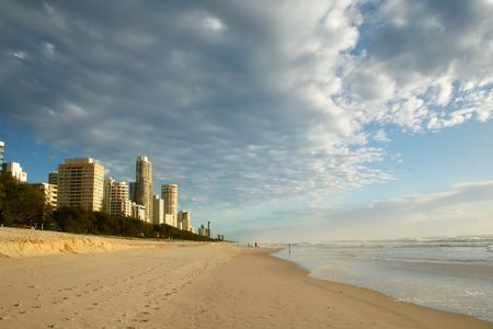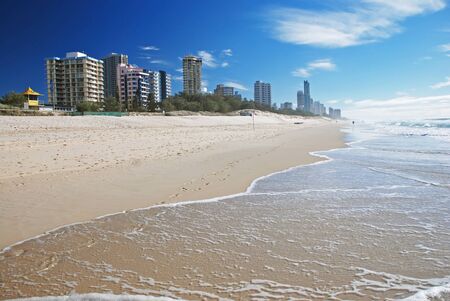 Australian coastline with sandy beach and waterfront buildings. Gold Coast, Australia