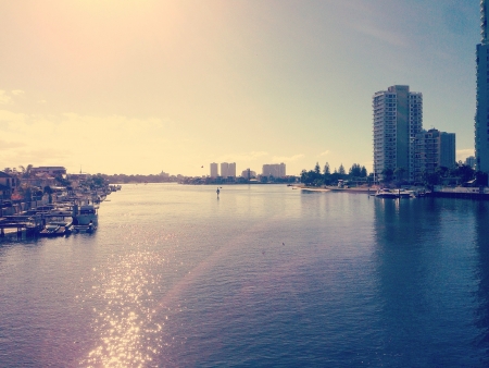 GOLD COAST, AUSTRALIA - January 6th, 2015: view of Surfers Paradise skyscrapers and water inlets at sunset